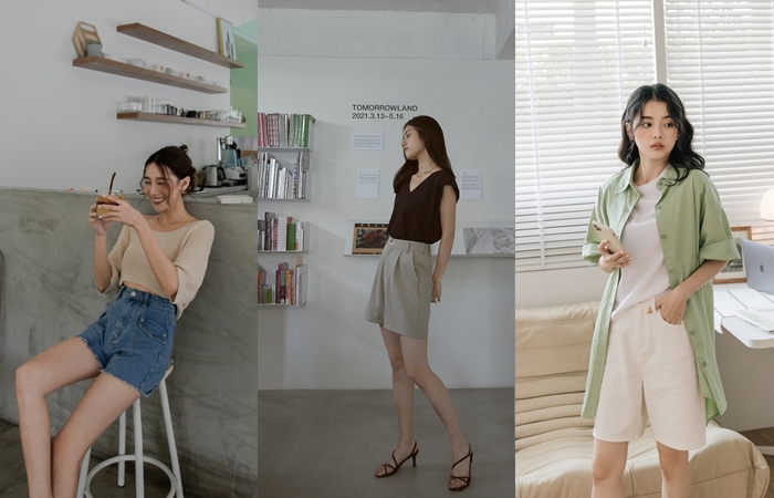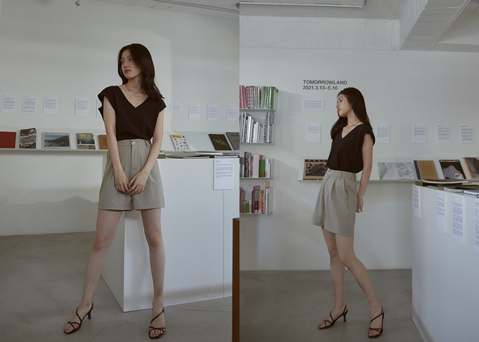 Y型是上寬下窄身形的女孩,著重縮減肩膀的寬度,再利用下身的單品平衡身形的比例,選擇五分寬版短褲,可以讓視覺放在臀部、大腿及膝蓋。