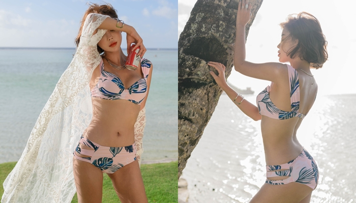 浪漫寬肩帶比基尼套組,以南洋風的葉子印花結合粉色系,讓整件比基尼充滿唯美氛圍,寬肩帶穿起來更有安全感。一件連身款︰暗藏小心機
