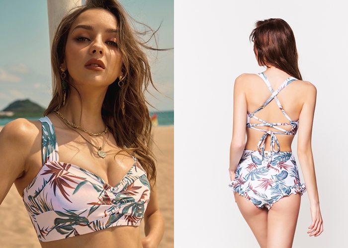 簡約背心平口比基尼,滿版的花葉圖樣,充滿渡假風,荷葉泳褲輕鬆遮住小腹及臀部,是零失誤的穿搭法!