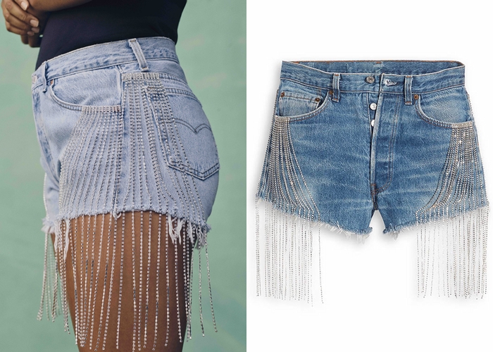 第2款:水晶流蘇丹寧短褲。充滿性感又吸睛的丹寧短褲,使用「復古501®短褲」製作,剪裁成黃金比例褲長、不收邊褲管,兩側更點綴水晶流蘇,垂墜的配件讓女生穿起來更有魅力。NT.7290元。