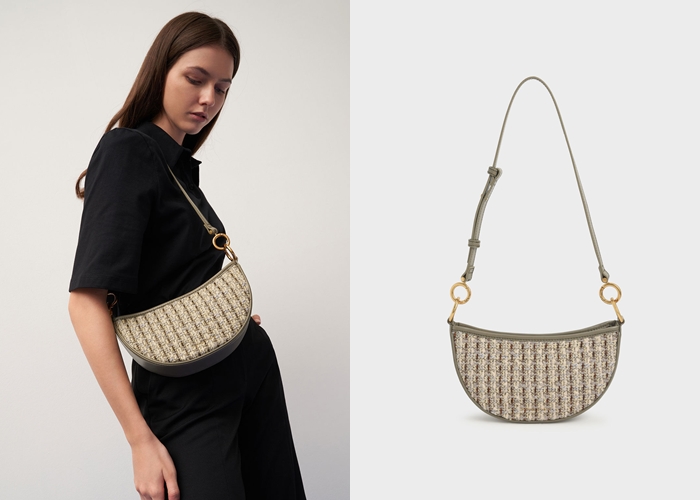 最特別是兩段式拼接背帶,讓你自由變換肩背或斜背包。灰褐色毛呢充滿秋日的柔和氣息,結合月牙型剪裁更顯得摩登,是低調內斂的風格。NT. 2190元。