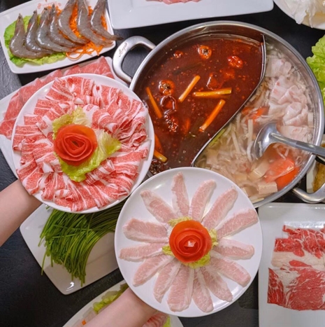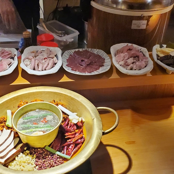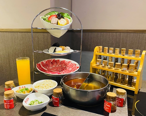 回客率超高的麻辣鍋,可以一次選擇兩種口味,讓你獨享鴛鴦鍋,它的湯底辣度和麻度吃得很過癮,而且鴨血、豆腐都是免費續,超華麗三層拼盤及菜盤,還有甜點讓你吃很飽。