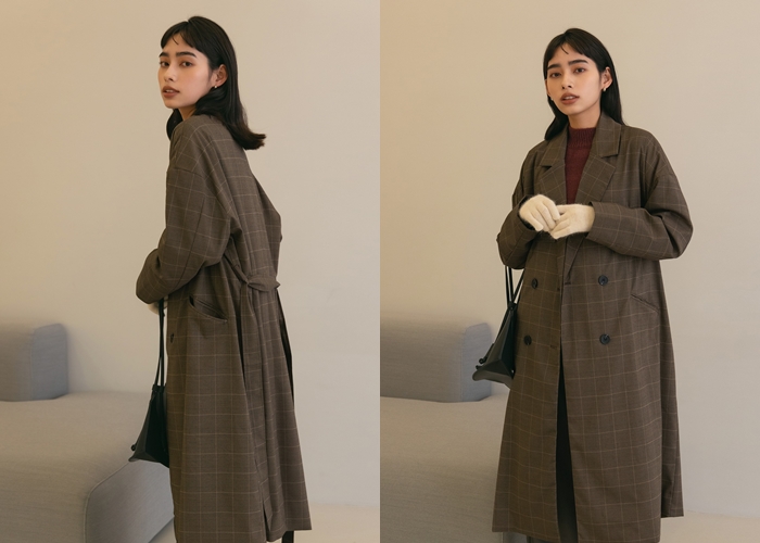看見秋冬精典必備的格紋元素,以深咖色搭配英倫造型,給人復古又帥氣的風格。衣服搭配暗紅、黑色、深藍或大地色系都是百搭組合唷!