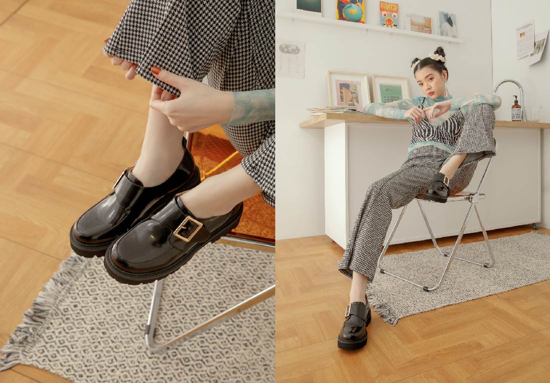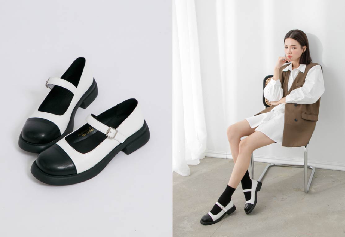 瑪莉珍鞋能夠營造復古可愛的氛圍,是甜美女孩必備的一款鞋子!這陣子韓國很流行黑、白拼色,在穿搭上更有跳躍感,而基本色系的組合也不用擔心太難搭配,只要一件洋裝就很ok啦!-