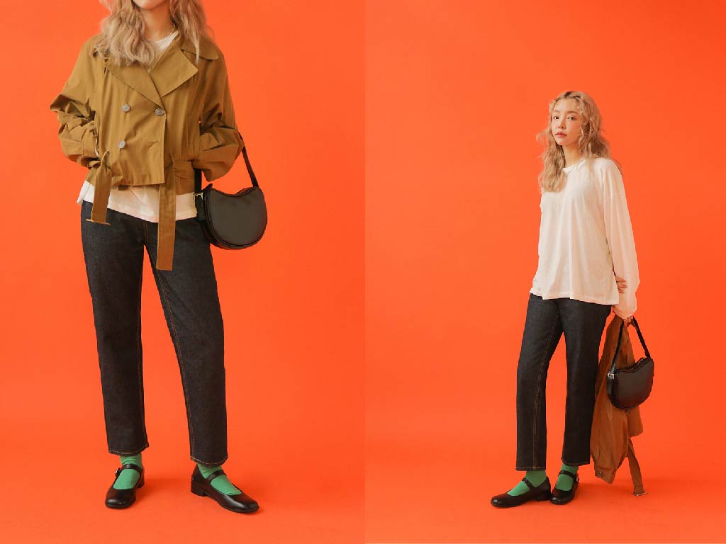 近年日韓流行的錐形牛仔褲就超適合骨架小蘋果型女孩~只要找到合身的版型、繫上皮帶,它就會把妳原本腰身在視覺縮小個2、3吋~-