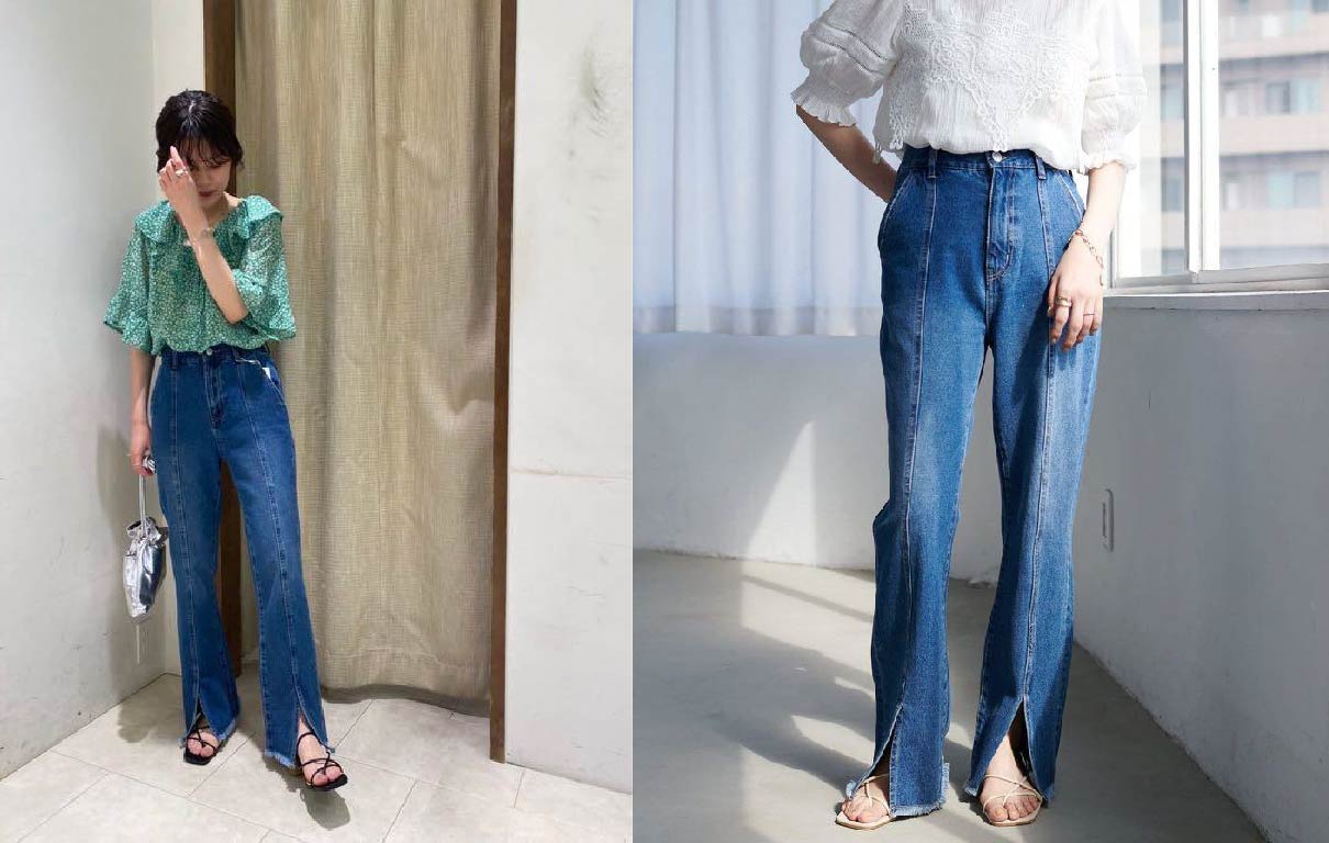 喇叭牛仔褲可以直接修飾掉小腿肚,如果再搭配前開衩褲腳設計,視覺上就會讓小腿跟褲子的空間空出很多,創造出筷子腿感!