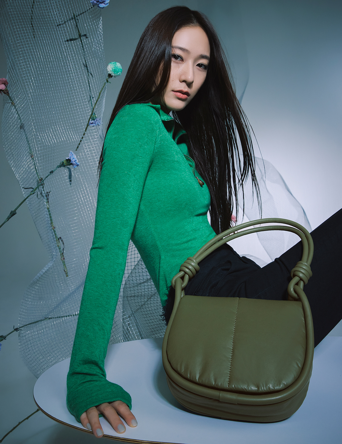 今年冬天的搭配重點,除了萬年不敗的深色系外,還有帶灰調的混濁特殊色!綠色毛衣讓Krystal膚色更白上了幾階,