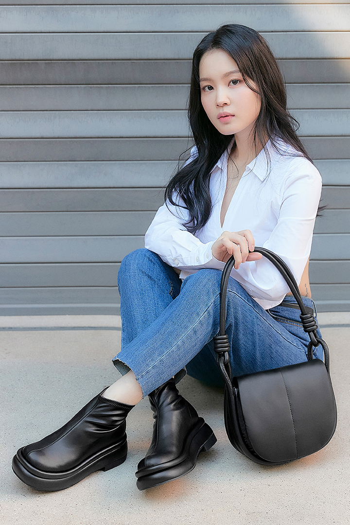 李遐怡的私服穿搭可以說是標準韓國歐膩的穿搭教科書,淺色牛仔褲、短版V領襯衫加上 Nola 厚底短靴,可以輕鬆駕馭任何場合,再拎上帶有扭結裝飾的Luna馬鞍包,完全就是最經典的乾淨俐落式韓系穿搭!-