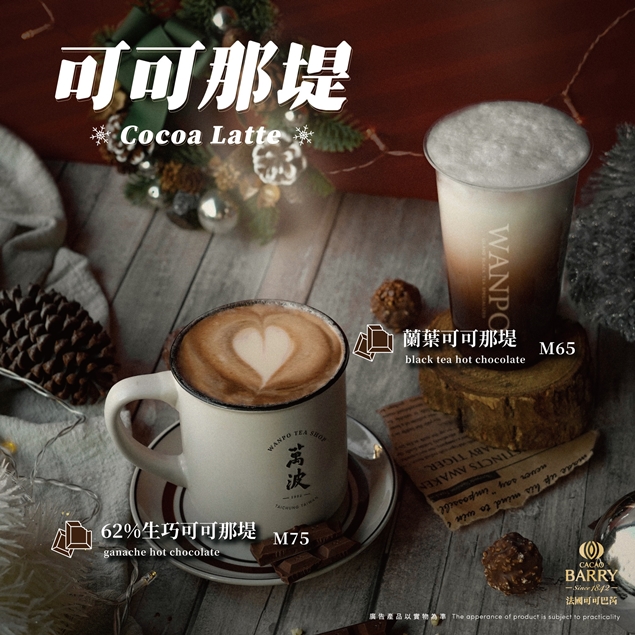 萬波推出2款「62%生巧可可那堤」及「蘭葉可可那堤」,皆嚴選法國百年巧克力品牌Cacao Barry 產品作為原料,將馥郁的純巧克力加入飲品中,色澤深重嚐起來又濃厚,可可風味絕對是節慶飲品,陪你迎接聖誕跨年!62%生巧可可那堤