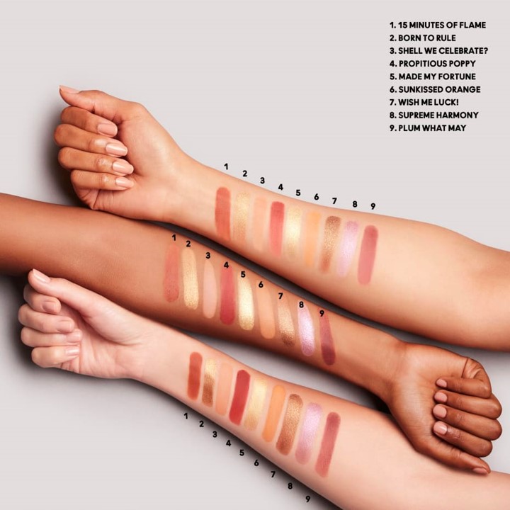 MADE MY FORTUNE眼影盤包含了9種顏色,不僅有適合新年的紅色、金色,還有日常百搭的駝色、棕色,且霧面和亮片色都有,無論是新年還是日常妝容,通通都可以一盤搞定!