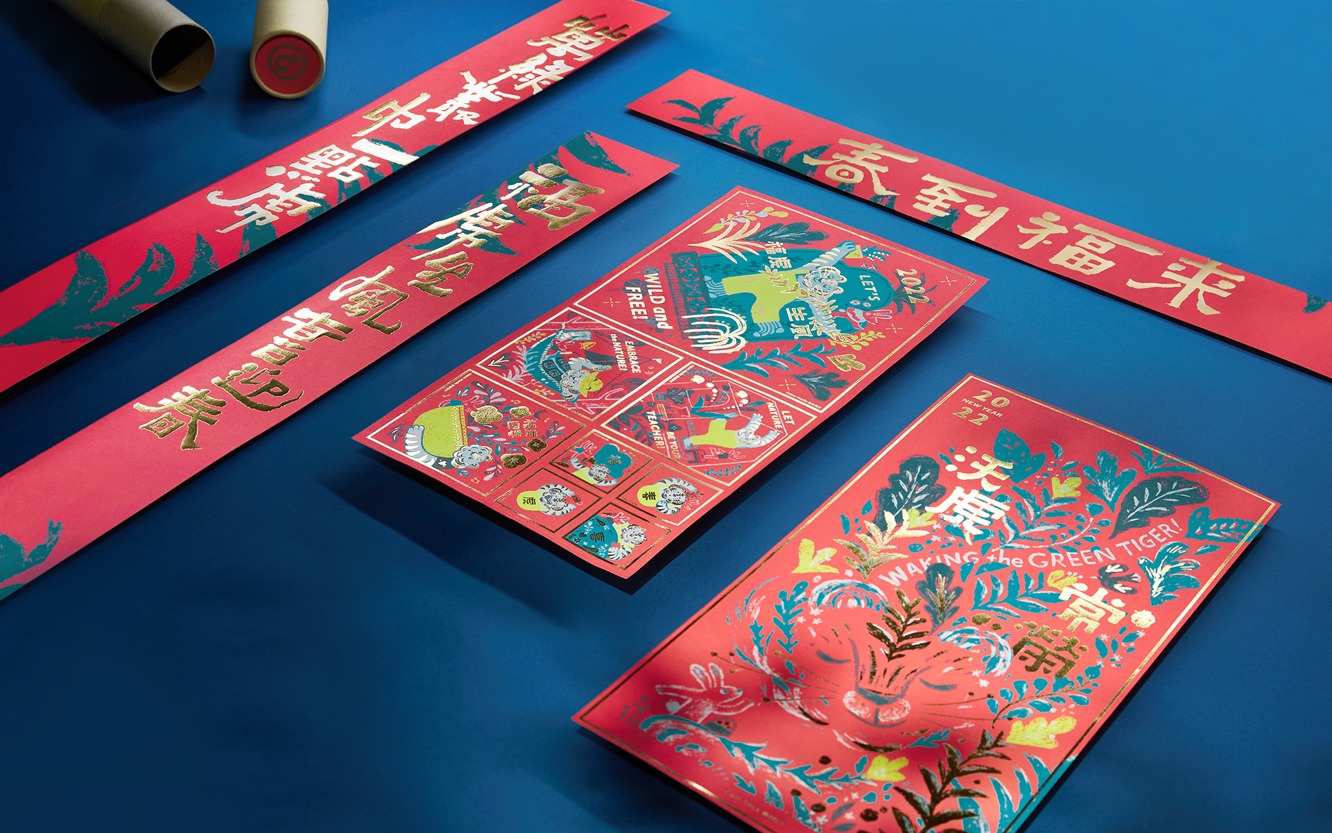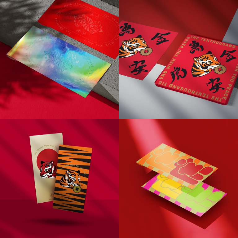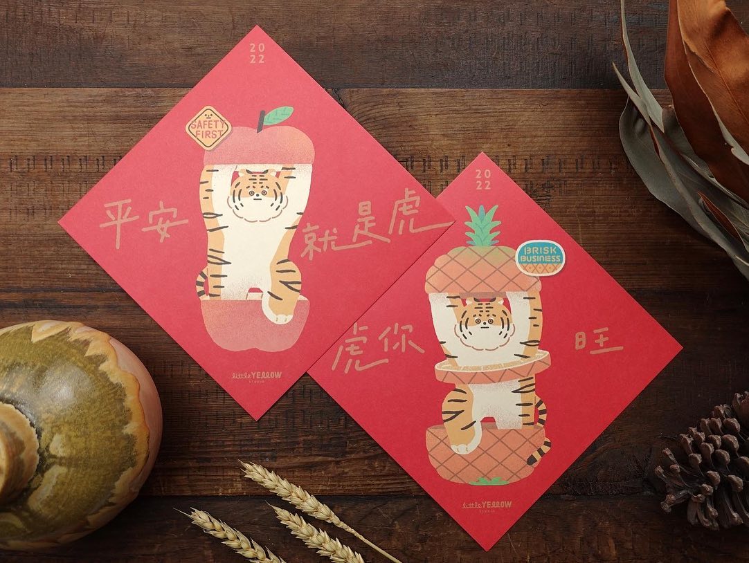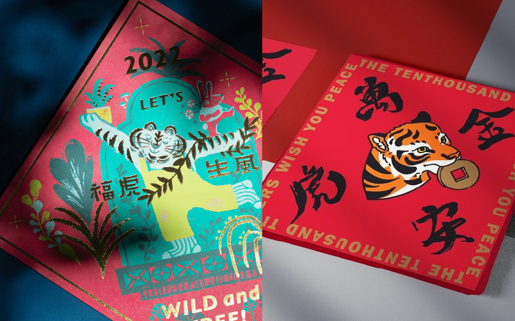 目光設計推出的紅包春聯組運用特殊的印刷和加工方式,讓紅包不屈就於平面設計,更多了凸、凹版印刷的手感,春聯中的老虎咬著金幣也象徵了財源滾滾,