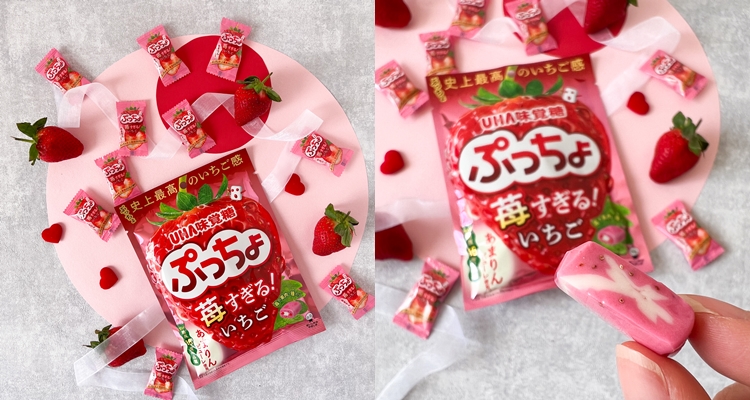 來自日本人氣零嘴,使用糖度高達18度的AMARIN夢幻草莓,咀嚼出草莓種子及果乾,夾餡口感超Q彈,NT.89元。