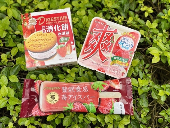 冰淇淋系列也不能放過草莓的口味,來自日本NIJIYA贅沢草莓冰棒NT.69元、爽冰淇淋草莓煉乳NT.59元、義美草莓消化餅冰淇淋NT.49元。