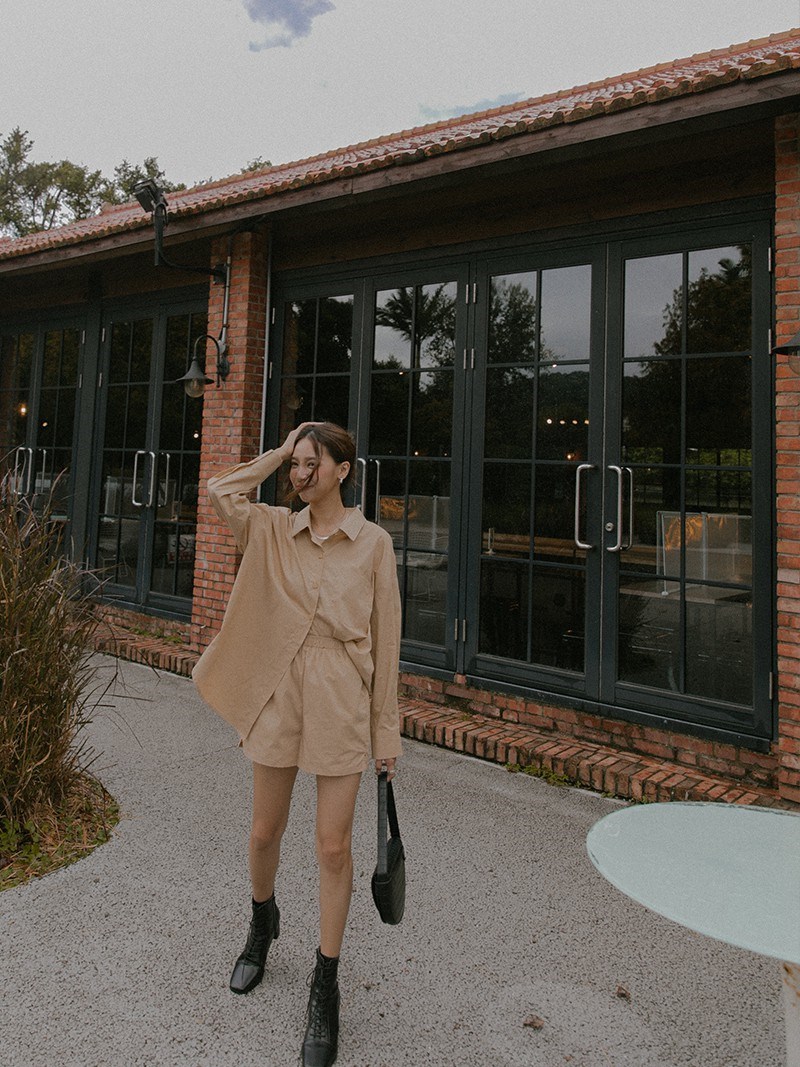 如果是喜歡襯衫Style的woo友,也有一秒就能完成的時尚套裝!溫暖又優雅的卡其色系,襯衫簡單扎進去,就能拉高腰線顯腿長,另外再搭配上修飾腿型的馬丁靴,就能呈現摩登幹練形象,瞬間吸引眾人目光!這款襯衫套裝是上長下短,很適合在天氣有時還是有點微涼的春天穿~【喜歡嗎?這邊還有】