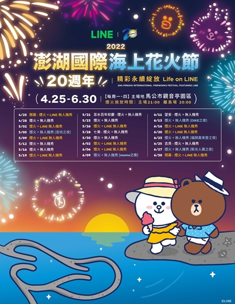 澎湖花火節在4月25日至6月30日登場,今年邁入20週年LINE FRIENDS熊大及兔兔找你一起看煙火!亞米特別為大家介紹來到澎湖怎麼玩才過癮呢?不僅欣賞煙火,白天的跳島行程及深夜住宿體驗都不要錯過,快提前訂行程吧~
