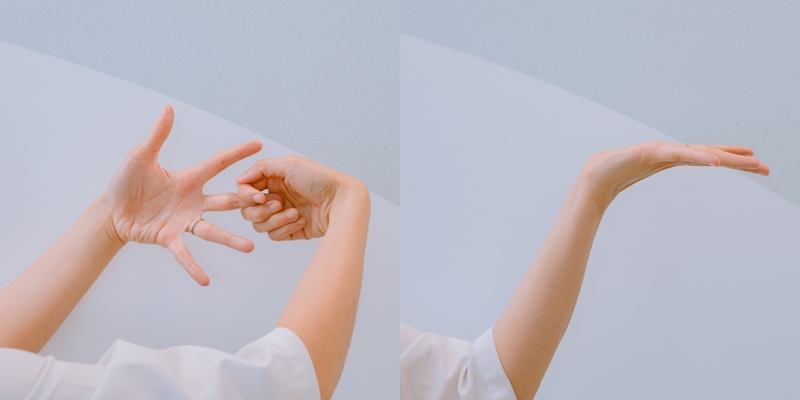 第五式:伸轉。輕輕轉動手腕,將手心手背向外攤平與伸展。