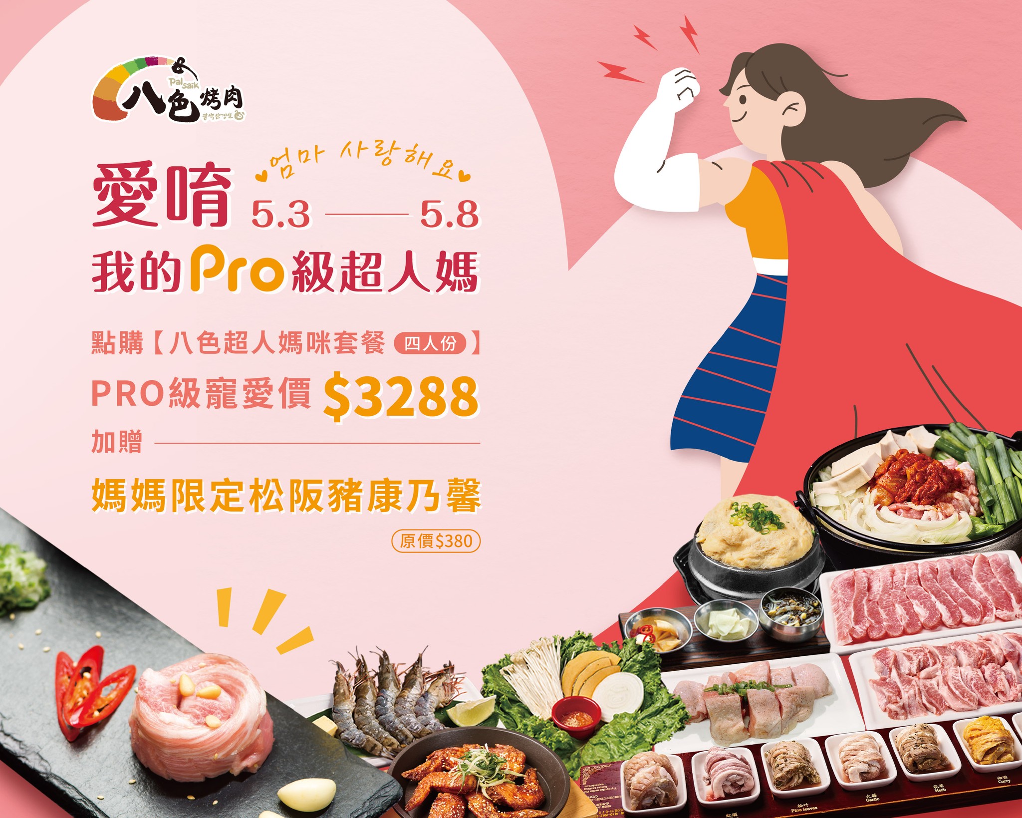 歐媽,莎朗嘿~八色烤肉【超人媽咪套餐】內含椒鹽去骨雞腿肉、伊比利豬肋條、嫩烤美國牛板腱...等,獻上極品好料融化媽咪的心2022母親節餐廳優惠:原燒