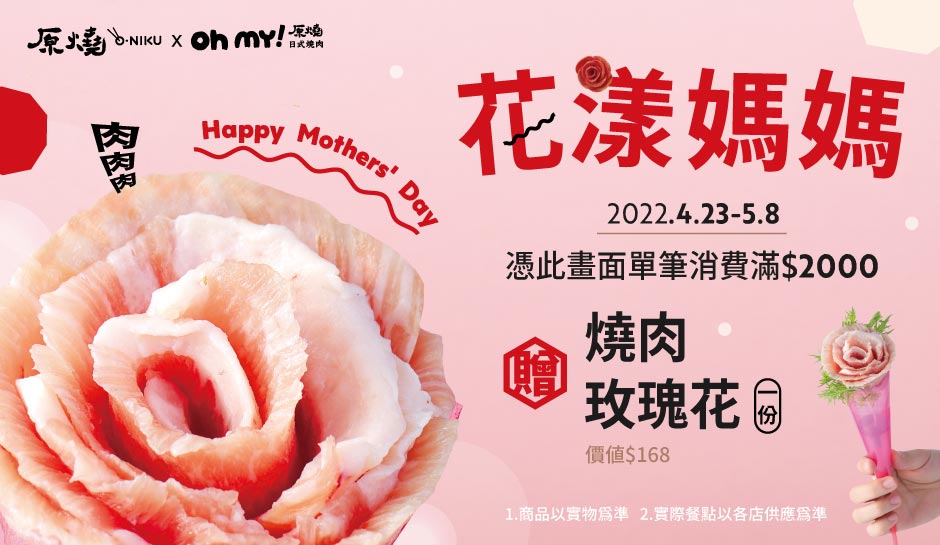 原燒母親節不只要用肉肉餵飽媽媽,還要送給最漾的她們浮誇系母親節禮物!2022/4/23-5/8,憑活動畫面截圖,於原燒內用消費或是外帶生鮮肉品,單筆消費金額滿$2000,即可獲得一朵燒肉玫瑰花!2022母親節餐廳優惠:小蒙牛