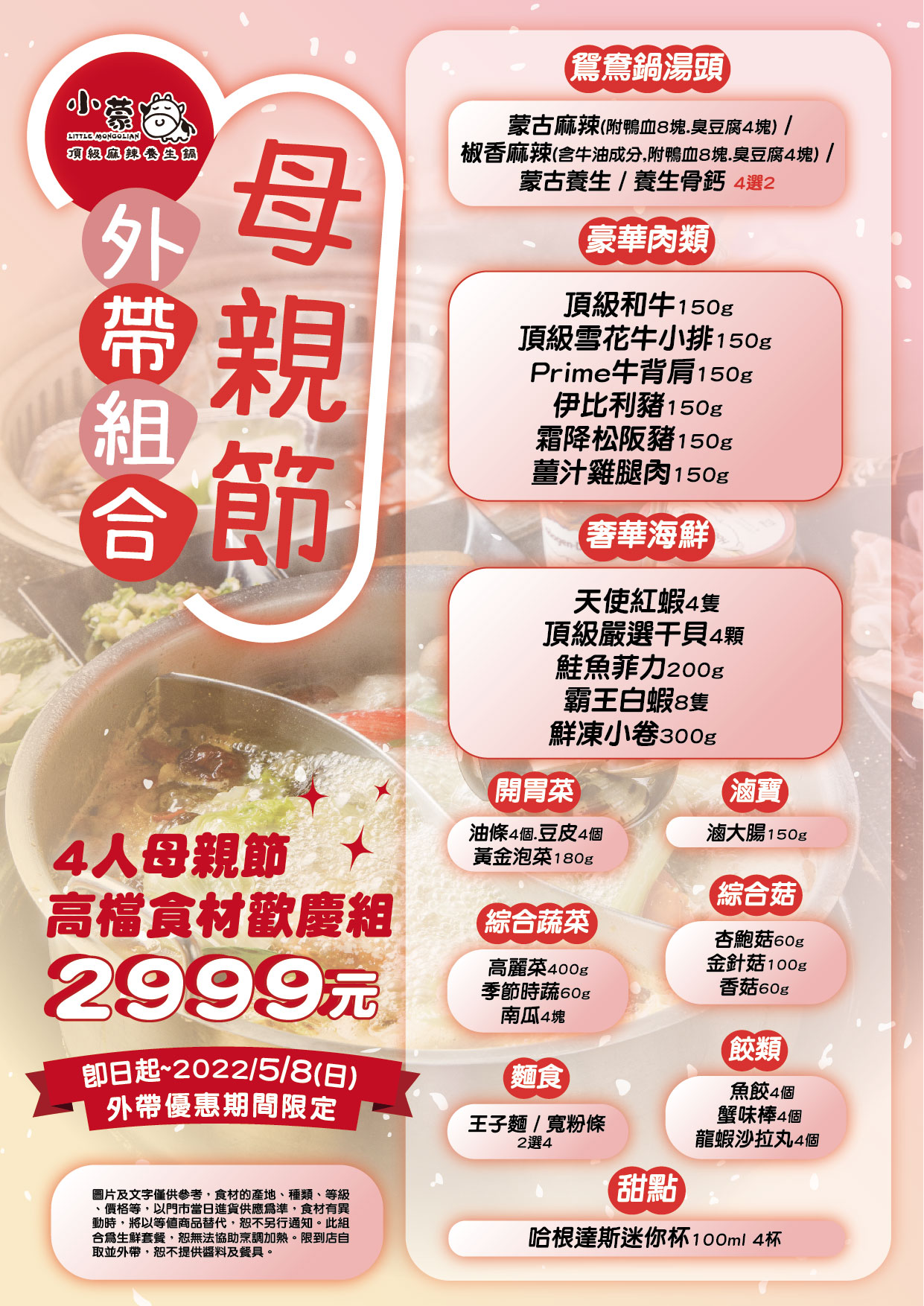 除了內用優惠外,小蒙牛也推出了超值的外帶套餐!雙湯底組合餐點,只需要思考湯底跟麵食,其他看到的通通都有,這麼澎派的從肉肉、海鮮到哈根達斯,都陪大家一起過母親節!2022母親節餐廳優惠:金色三麥