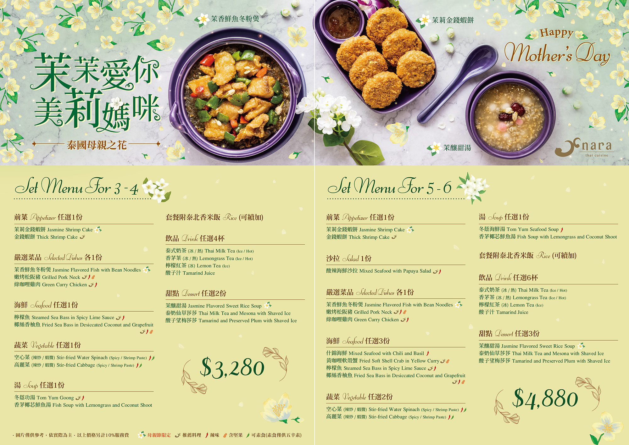 饗愛媽咪外帶套餐熱烈販售中~饗食天堂推出饗愛媽咪外帶套餐,讓孝子們省下親手下廚的手忙腳亂,好好慰勞媽咪的辛勞!套餐內含山海大拼盤、大口饗肋骨、德國豬腳、紅酒燴牛肉/霸王櫻桃鴨(切塊)【二選一】、姿燒香魚、地中海白酒燴海鮮、鮭魚功夫炒飯、櫻花蝦高麗菜、干貝竹笙雞湯共9道經典料理和1個7吋蛋糕,$3,988元限量販售中!2022母親節餐廳優惠:NARA Thai Cuisine