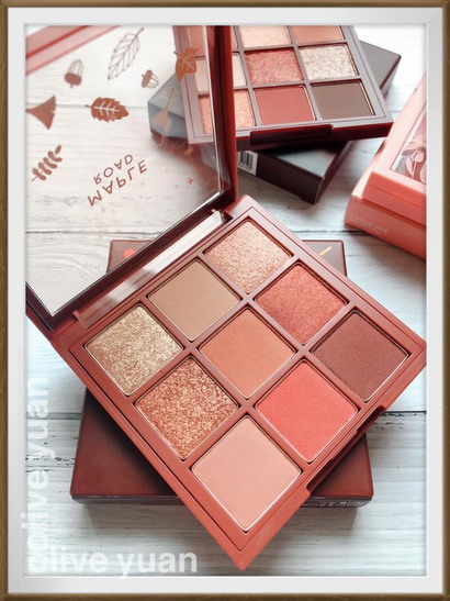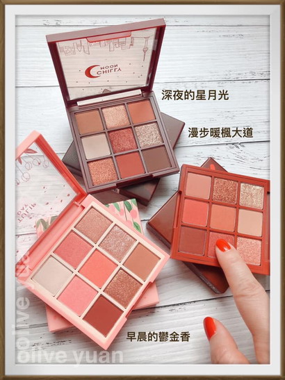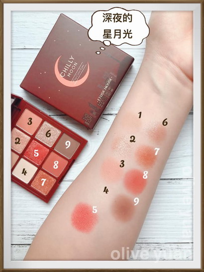 「深夜的星月光」好濃甜,根本就像一盤巧克力,而且顏色好浪漫,性感又閃耀!其中最喜歡5.月光的冷冽,好美好美,6.深夜的星空、7.月光與星空也好閃。我雖然比較少用粉霧眼影,但屬於酒紅咖啡色的8.都市的夜空用起來超美的,可以呈現出好多不同的眼妝效果。