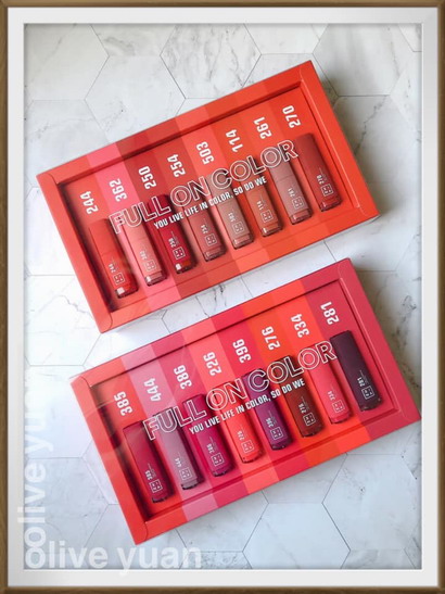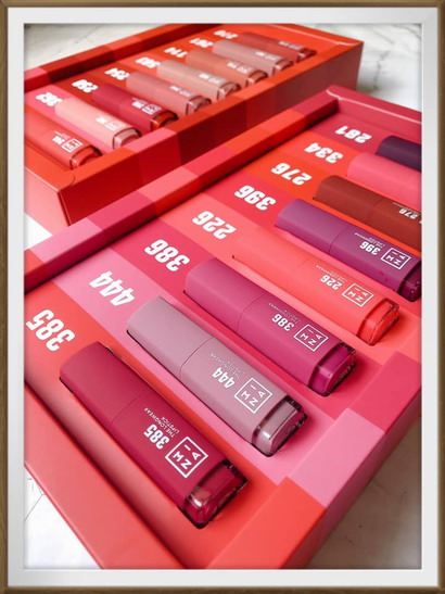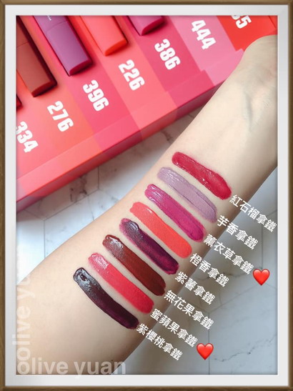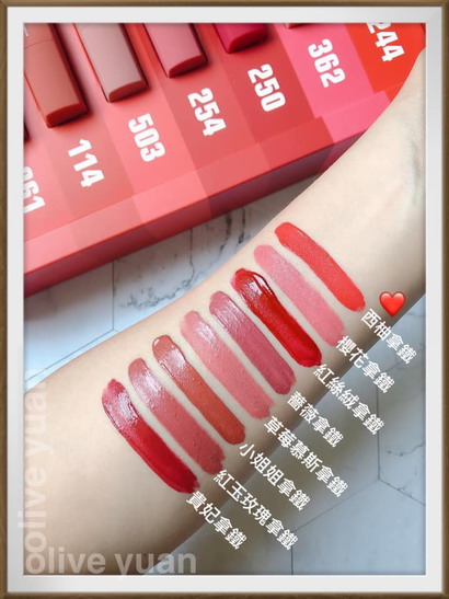 「460粉藕情迷」堪稱所有女孩應該最先買的第一個色號,而在晚間室內燈光下,最令人想要親吻的色號則是「766玫粉派對」,「460粉藕情迷」跟「362肉桂蜜紅」是其中的兩款珠光,其他則是霧光。然後「362肉桂蜜紅」及「773艶陽時刻」為寶雅獨家,「761嗆辣紅椒」及「762沙漠玫瑰」則是屈臣氏獨家。