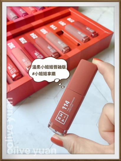 唇彩賣得最好的「溫柔小姐姐」色也推出了唇釉版取名「114小姐姐拿鐵」,是紅棕暖土色,也在這次主打色中,這款唇膏的設計也很用心,包裝依然走色票路線,除了瓶身有大大色號之外,畢竟瓶身跟顏色會有落差,底部的透明設計能清楚辨識唇膏顏色,說真的因為現在每個人至少都有10支以上的唇膏,每一支都要打開看可受不了。