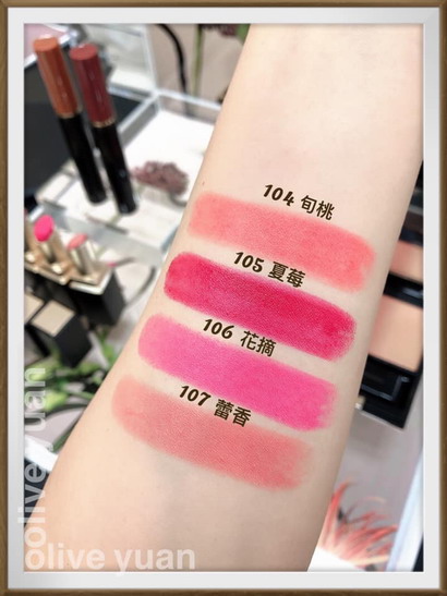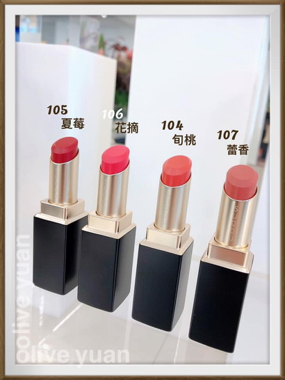 「晶采柔艶唇膏(NT1,900)」有四個顏色,主要是綻放微光感的柔霧光質感,「104旬桃」屬於康乃馨粉紅色調,「105夏莓」最鮮艷,它是蔓越莓色調,「106花摘」是山茶花粉紅色調,很接近桃紅色,「107蕾香」則是貝殼粉紅色調,偏裸色,雖然是柔霧光質感唇膏可是一點都不乾澀,還算蠻滋潤的,我入手的是「107蕾香」。