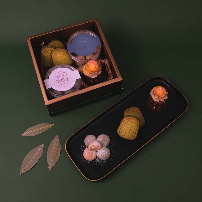 來自新竹的甜點工作室餅不甜、半吊子廚房聯手推出極具質感的端午禮盒,並把端午的元素意象化,作為西點創作的靈感~像是粽葉色的蜂蜜綠茶夾心餅乾、粽子裡不可或缺的鹹蛋黃被擺在可麗露上頭等等,是款很有巧思且值得玩味的禮盒選擇!-