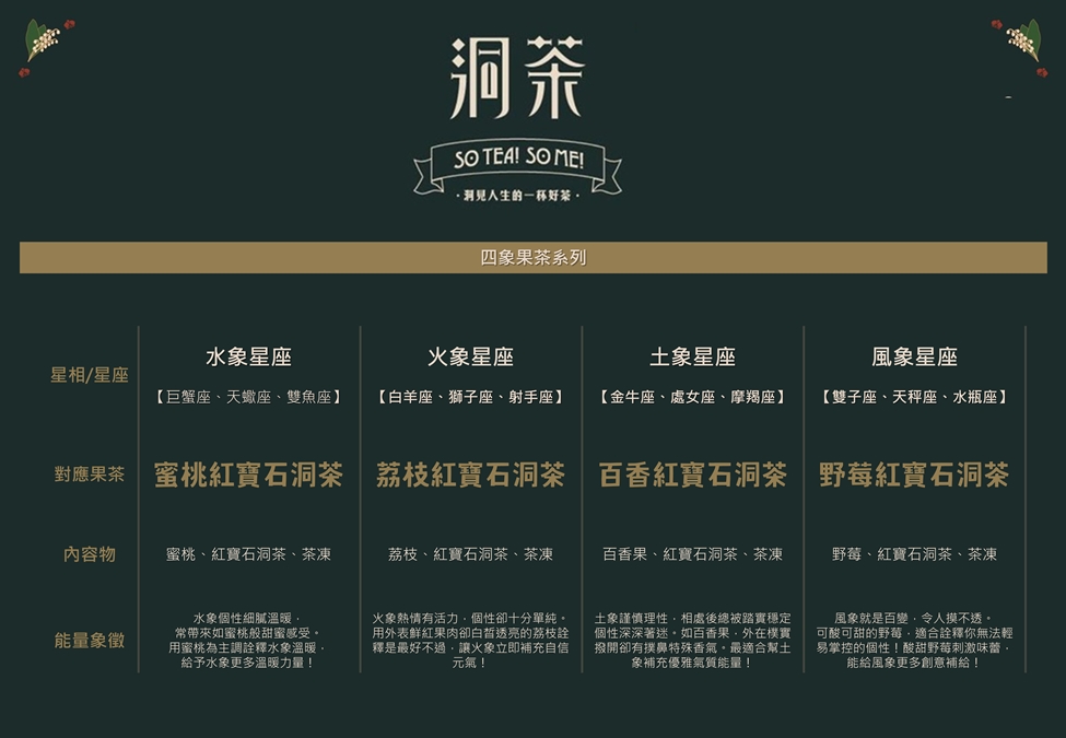 四大星象迷必喝:塔羅命理師們特別為風、水、火、土四象星座規劃出不同的水果特性,搭配招牌紅玉凍茶,簡直提供大家客製化的味覺刺激!每款果茶還又對照解說圖卡,給你滿滿的超能補給。