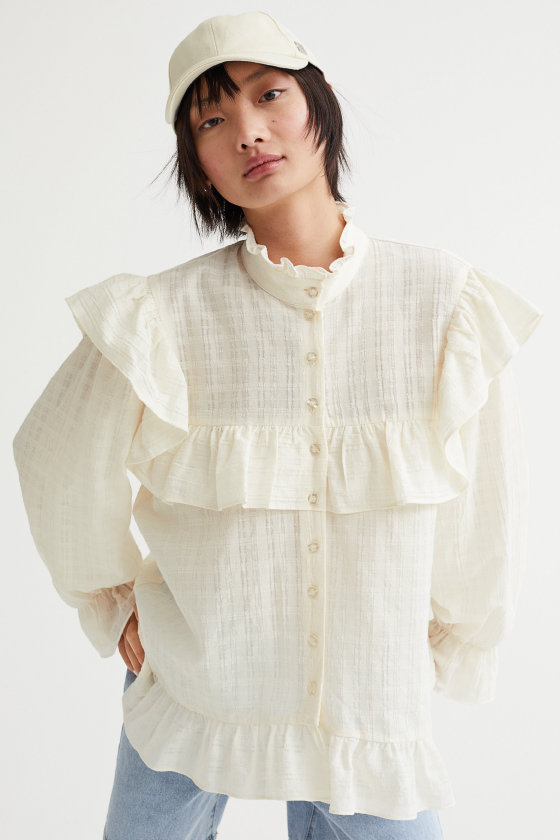 這個襯衫實在太適合在冷氣工作的上班族們~荷葉邊散發女性的溫柔氣氣質,立領和落肩設計則把整體的氣勢提拉起來,女生就是要會打扮又會工作!
