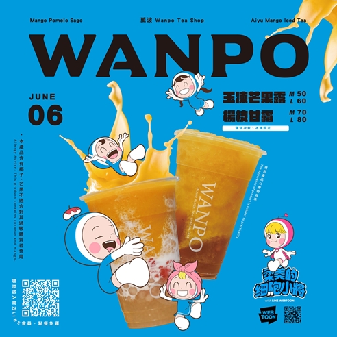 手搖品牌「萬波」今年夏天為大家帶來一場療癒系體驗,首次與LINE WEBTOON推出韓國原創IP跨海聯名,在全台設立2間《柔美的細胞小將》的萬波概念店,讓影迷和吃貨們嚐到最「芒」的療癒飲品。夏季人氣款「楊枝甘露」、「玉凍芒果露」重磅登場啦!趕緊去打卡拍照、嚐鮮去~