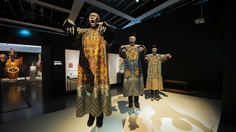而說到亞洲的鬼片你會想到什麼?不少人一定優先想到道長林正英所飾演的「殭屍」系列作品!在這次「亞洲的地域與幽魂展」中,未開展就在社群上爆紅的作品,正就是這座由法國凱布朗利博物館收藏的清代殭屍歷史文物打造的「殭屍」。看到第一張如此真實恐怖的殭屍展品,偷偷告訴大家一個小秘密,據說連殭屍服都是由真的殭屍穿過的服飾穿戴上的殭屍模型!讓人隔著螢幕都冷汗直流啊!