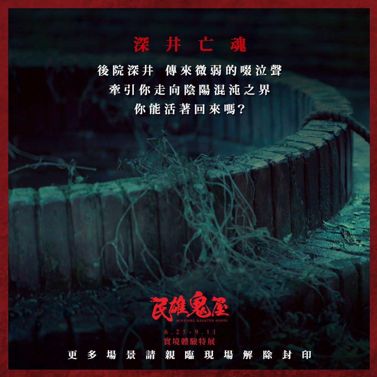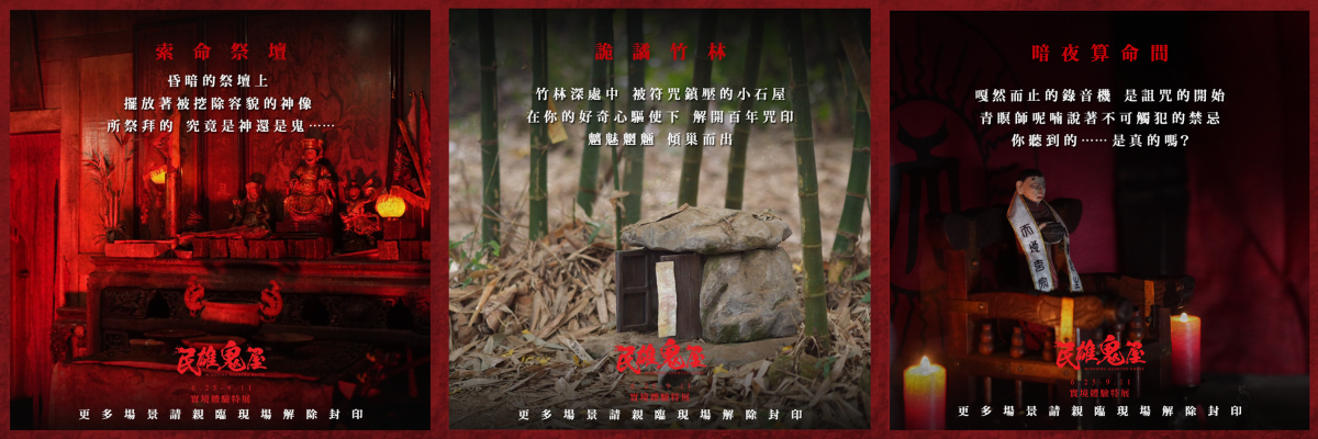 展覽現場也分成AB兩個場館,分別是A館「禁忌深淵」以及B館「穿梭陰陽」。A館將呈現電影《民雄鬼屋》當中的戶外場景,帶領民眾一步步進入恐懼深淵之中。進入竹林、公墓,校園泳池的無頭命案傳說,最後直搗民雄古宅。而B館則是以民雄古宅為主體,探掘古宅深井裡到底藏著什麼驚人秘密?並讓觀眾跟著失語的亡靈帶領觀者一步步找出真正的兇手。