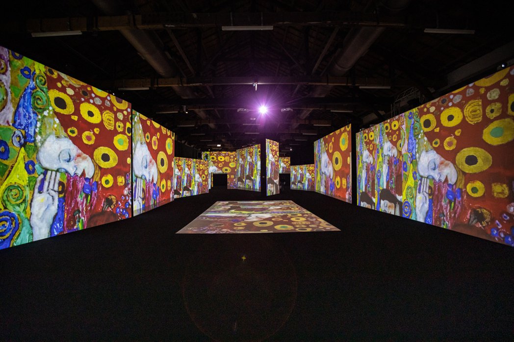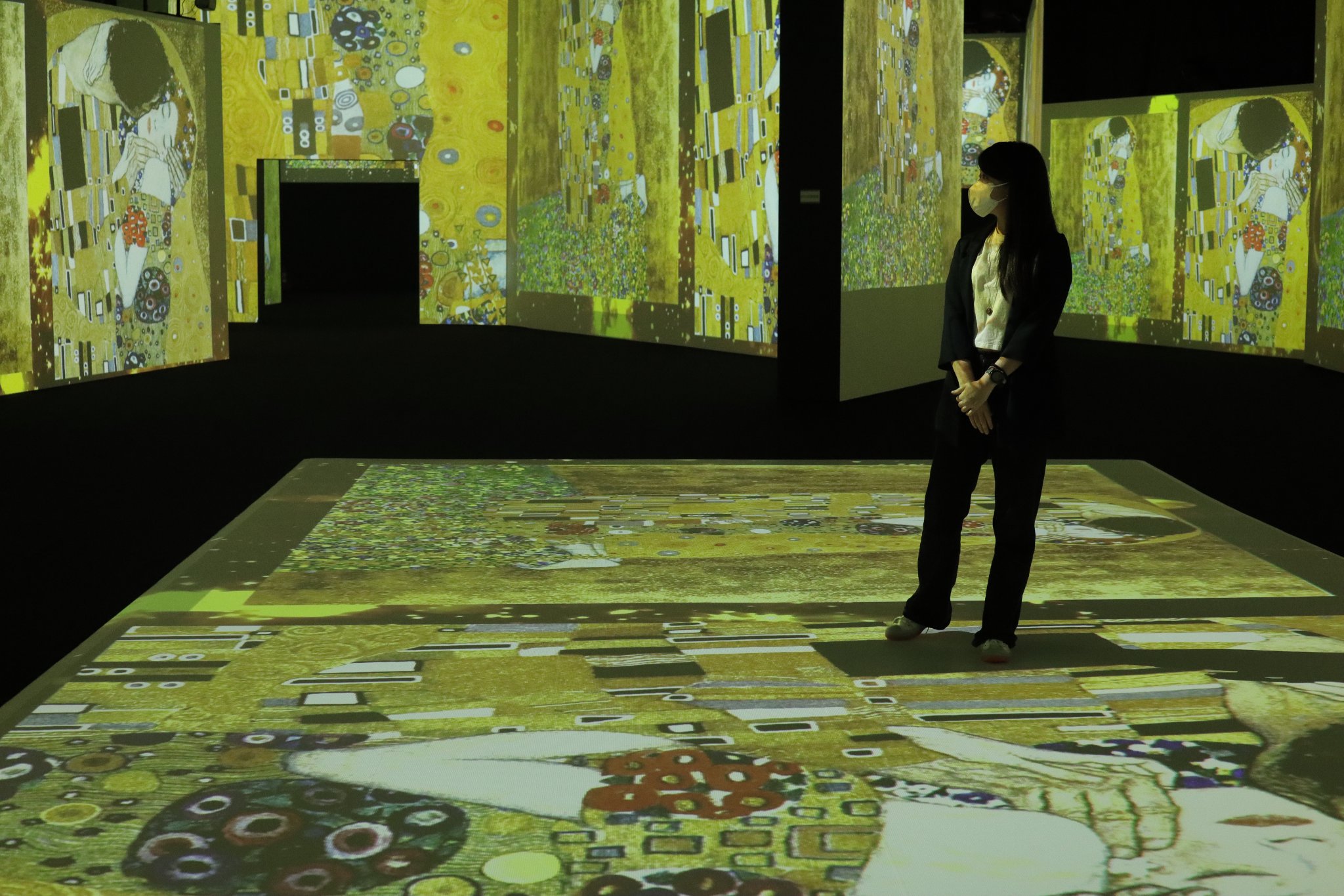 這次展覽共分為三大展區。第一展區以巨幕投影名畫的展間開啟這次的金色之旅;主展覽區60分鐘的體驗則完展呈現靠林母的第一幅到最後一幅畫,結合燈光、色彩、動態、音樂及音效,