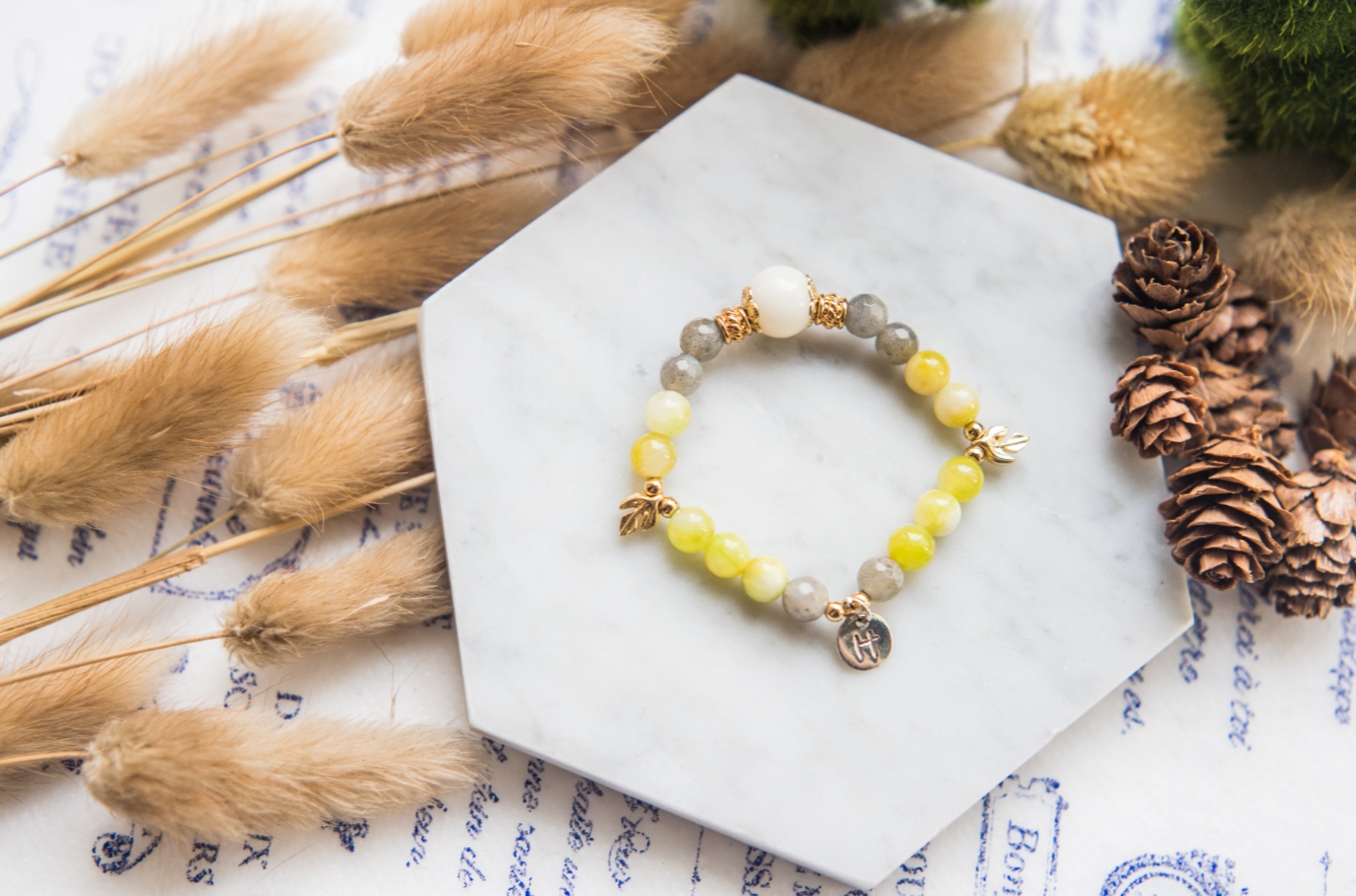 ▲〈寸草心〉(小孩款)-設計14-15cm的鍊子,適合3-5歲的孩子配戴。替孩子戴上由日本天河石、糖果石和母乳球打造的手鍊,不僅顏色活潑可愛,更讓孩子彷彿時時刻刻都有母親的愛在身旁陪伴守護!