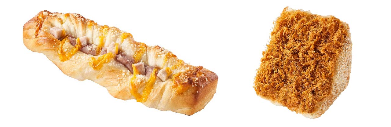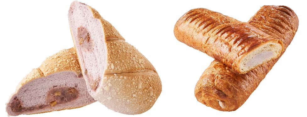 「芋頭切達起司麵包」內線同樣採用檳榔芋製成的內餡,搭配蜜芋頭和起司醬,鹹甜滋味超涮嘴;由生吐司麵糰製成的「鹹香芋頭肉脯麵包」,佐以香菇芋頭餡、肉脯和白芝麻,芋頭配肉鬆就是無敵,不服來辯!