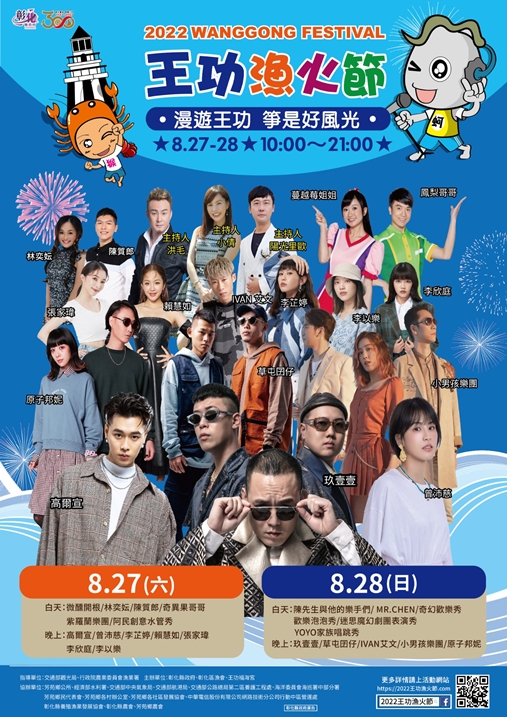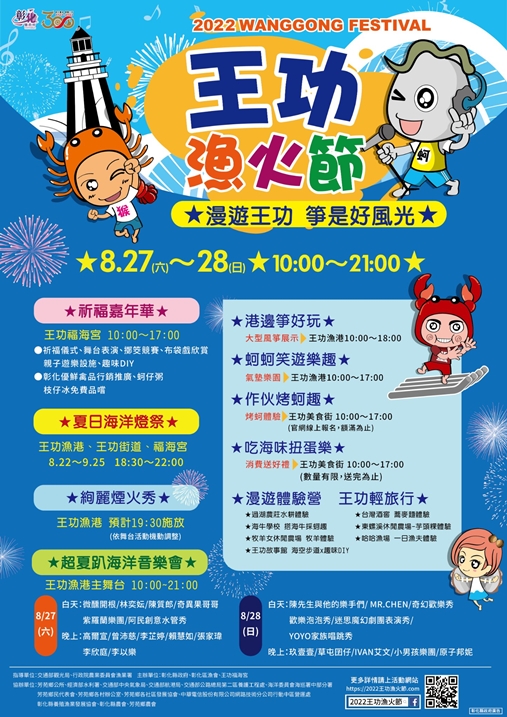 被疫情耽誤的彰化人的夏季盛會「王功漁火節」終於回歸。今年邁入第18年特別請芳苑鄉王功福海宮的媽祖指示,將在8月27日、8月28日登場,活動邀請各大明星卡司輪番表演,還有最令人期待的煙火秀及周邊活動等你來體驗!