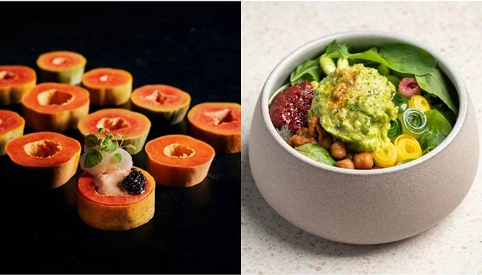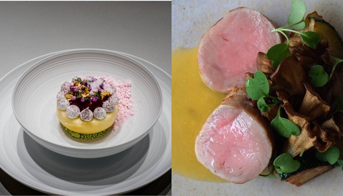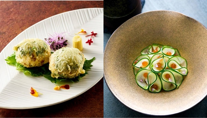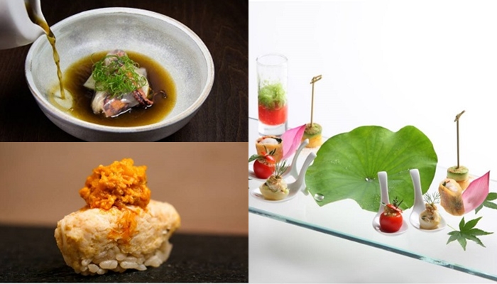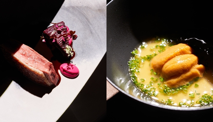 「Liberté」大廚武田健志曾在法國工作,美食作品色彩奔放、層次豐富,更呈現時令變化的細膩(上圖)。「承Sho」是日本東京二星餐廳「傳」(Den)的首間海外姊妹店,由副主廚藤本詳一主理,從臺灣各處取材,發會在細膩的經典菜色中,更融入主廚活潑、趣味的個性。(下圖)