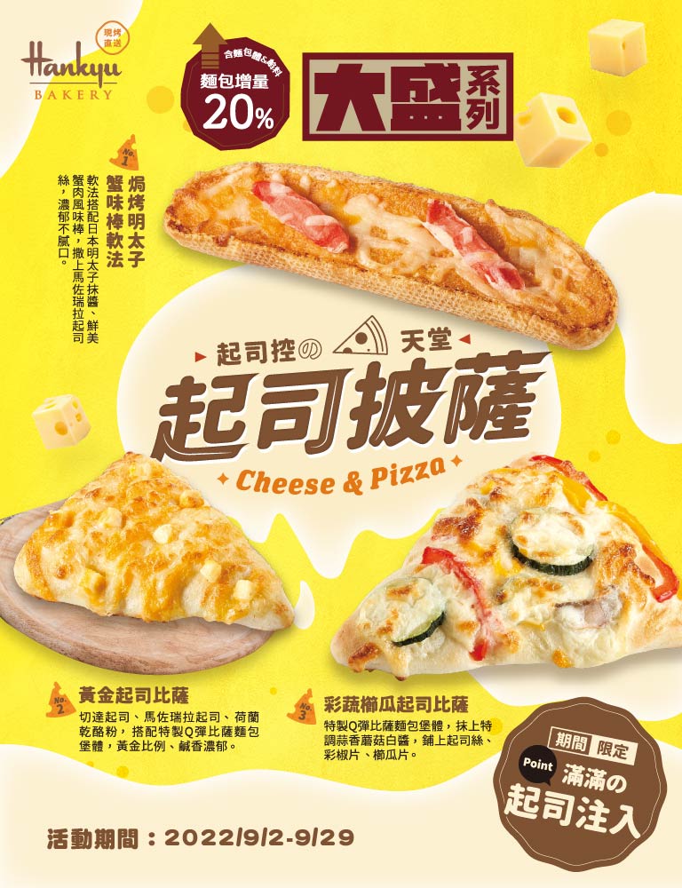 幾乎每次都會和We Sweet同步推出新品的大盛系列麵包,這次端出滿滿起司香,最經典的黃金起司比薩、營養滿分的彩蔬櫛瓜起司比薩、料多實在的焗烤明太子蟹味棒軟法都很有飽足感,