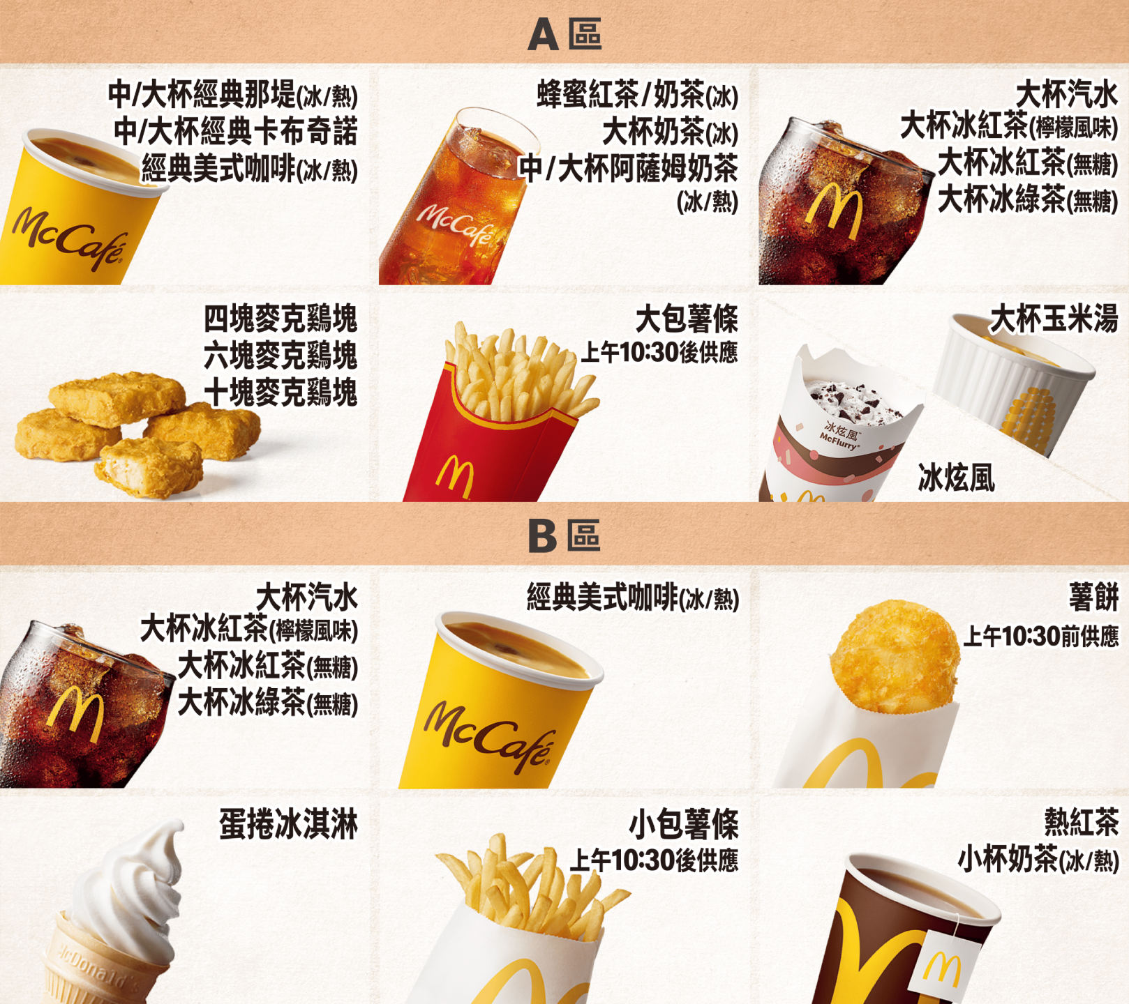 麥當勞甜心卡使用方式:凡持卡於麥當勞餐廳購買A區產品,即免費贈送B區產品;使用期限至2023年3月31日止。