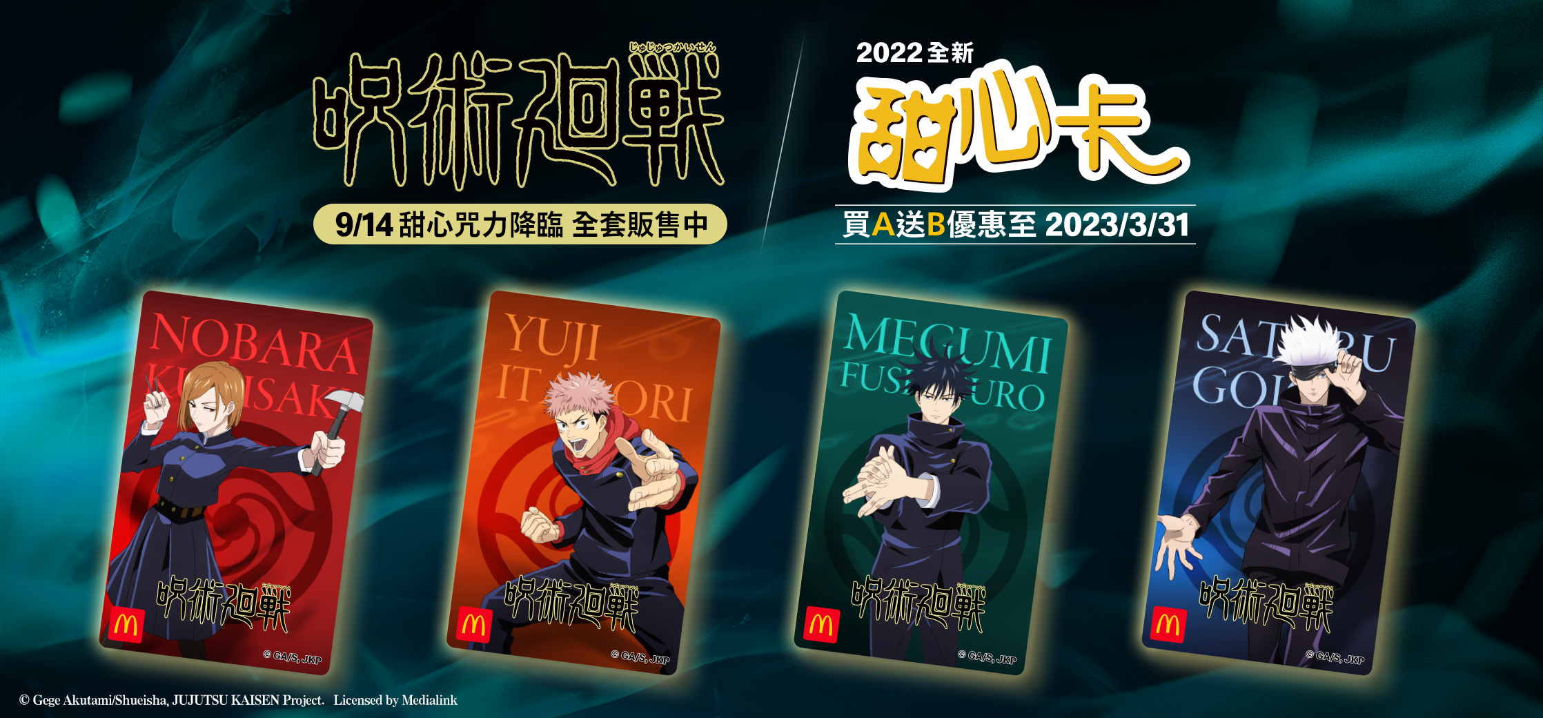 台灣麥當勞首度聯名日本漫畫《咒術迴戰》推出限量50萬張聯名款甜心卡,在櫃台、得來速、歡樂送等外送平台都有販售,《咒術迴戰》甜心卡以四位主角為設計,全套共4張,同享「買A送B」優惠,特價39元,可使用至明年3月底。