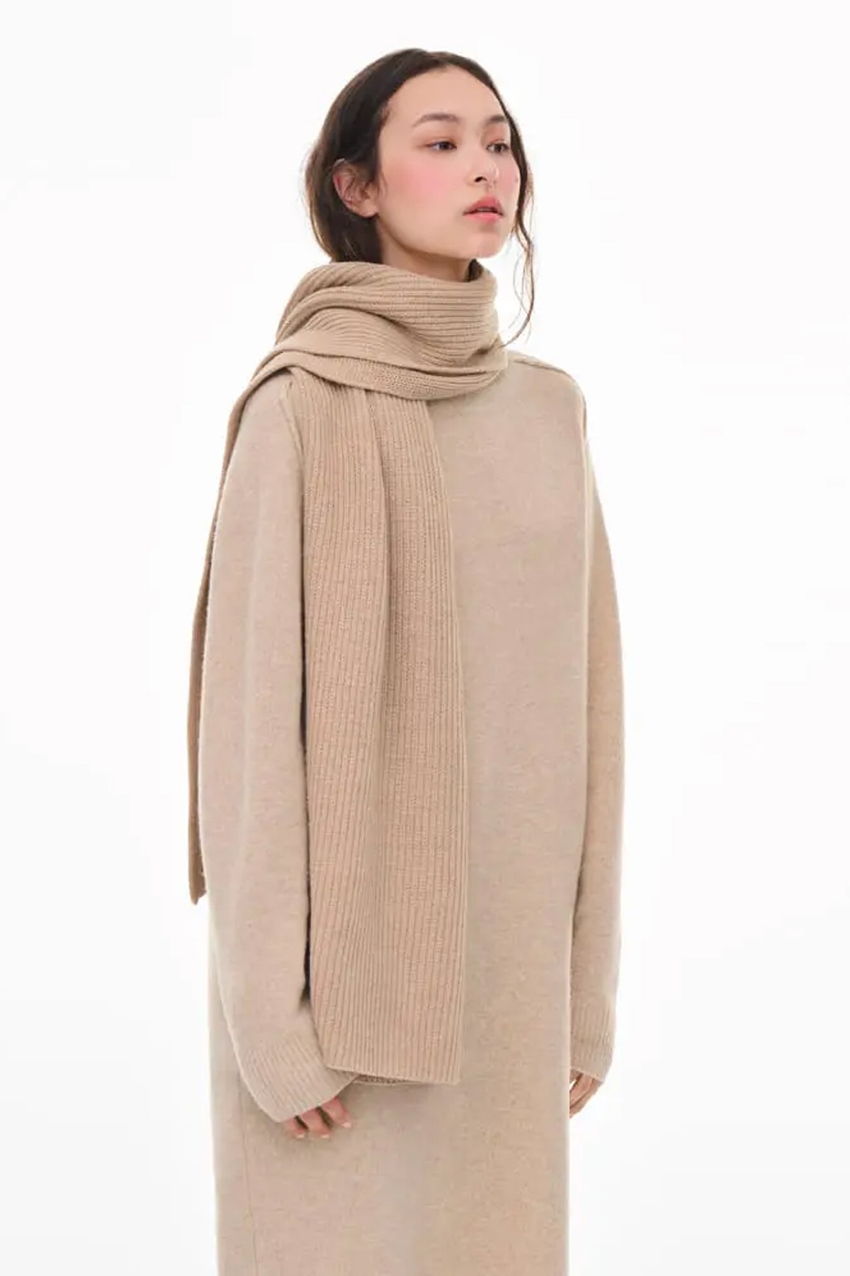 小羊毛圓領洋裝搭配同色系針織圍巾,顯現慵懶氣質,穿搭沒靈感的時候就這樣出門吧!