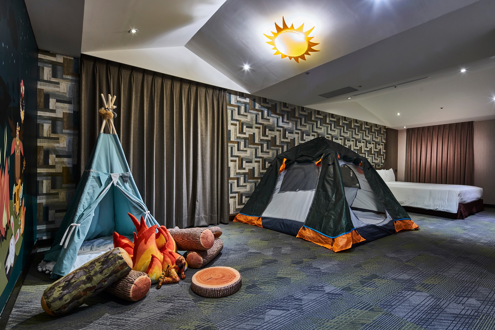 營火主題的親子房型,提供帳篷及床組兩種住宿體驗,還有在室內玩搭營火的情境真的太有趣了!