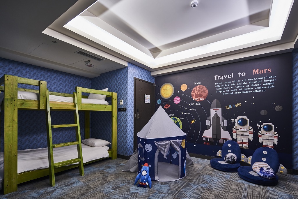 太空主題的親子房型,上下舖床型及小太空帳篷及坐墊,充滿溫馨小窩,讓小孩更喜歡這樣的環境。