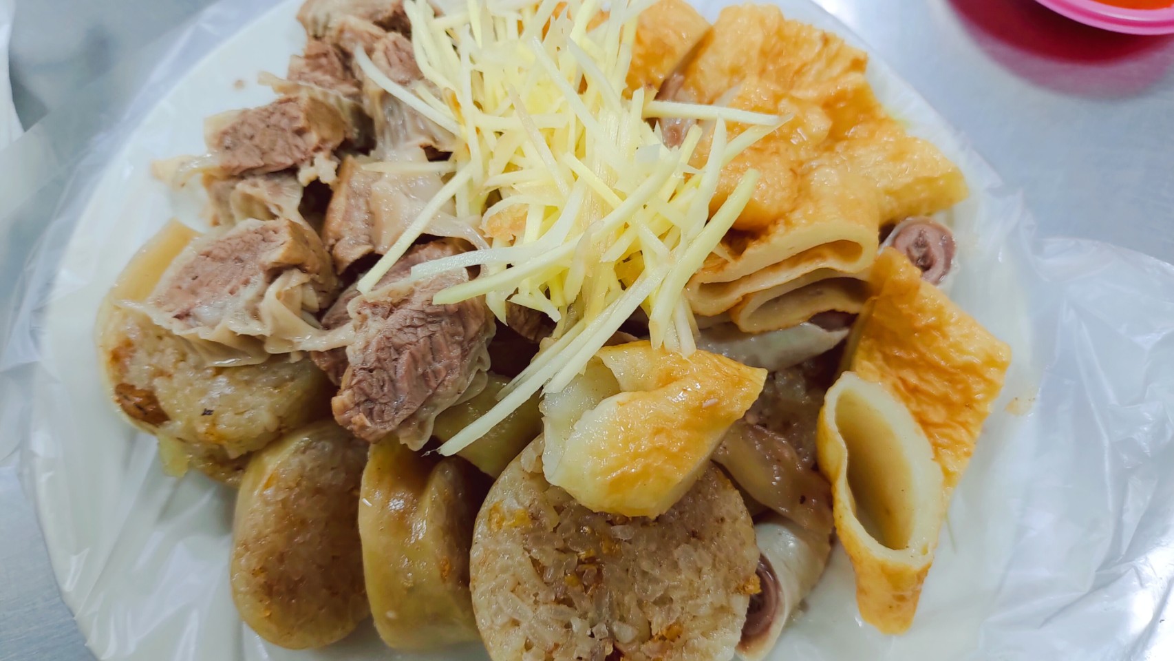 基隆真是內臟人的天堂~這一盤裡有吉古拉、大腸圈、肝連、豬肚帶,滿滿分量只用$130喔~其中最推薦大腸圈和豬肚帶!大腸圈與糯米腸最大的不同,就是外面的腸衣了!大腸圈是將料灌進豬大腸而非我們現在最常吃到的人工腸衣,相較起來更有嚼勁Q彈喔;而豬肚帶真的非常少見,豬肚帶其實就是「連著豬肚的豬食道」,吃起來沒有豬肚軟爛,反而更接近粉腸的口感,但口感卻比粉腸更有層次,越吃越香~