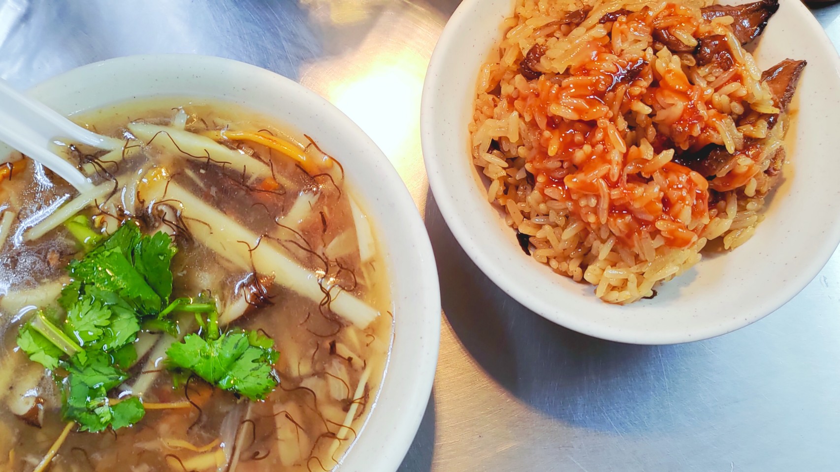 吳記螃蟹羹只有賣兩種東西:螃蟹羹、油飯。螃蟹羹因為在湯頭裡添加了金針、髮菜、香菇、筍絲熬煮,加上沒有過多的勾芡,喝起來沒有羹的厚重濃稠感,反倒意外清爽清甜,湯裡的蟹腳肉也非常鮮嫩~一旁的油飯也是清爽路線,粒粒分明、不黏牙,一口羹一口飯,完全就是在地好滋味!