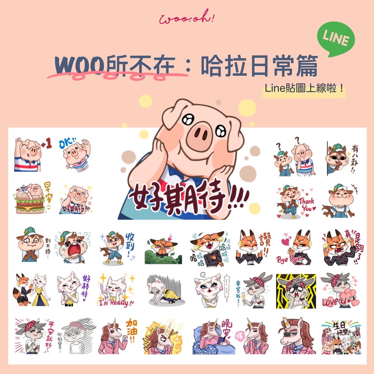 我們的第一版貼圖是woo所不在#哈拉日常篇。 就是讓你瞎哈拉都能派上用場的對話貼圖