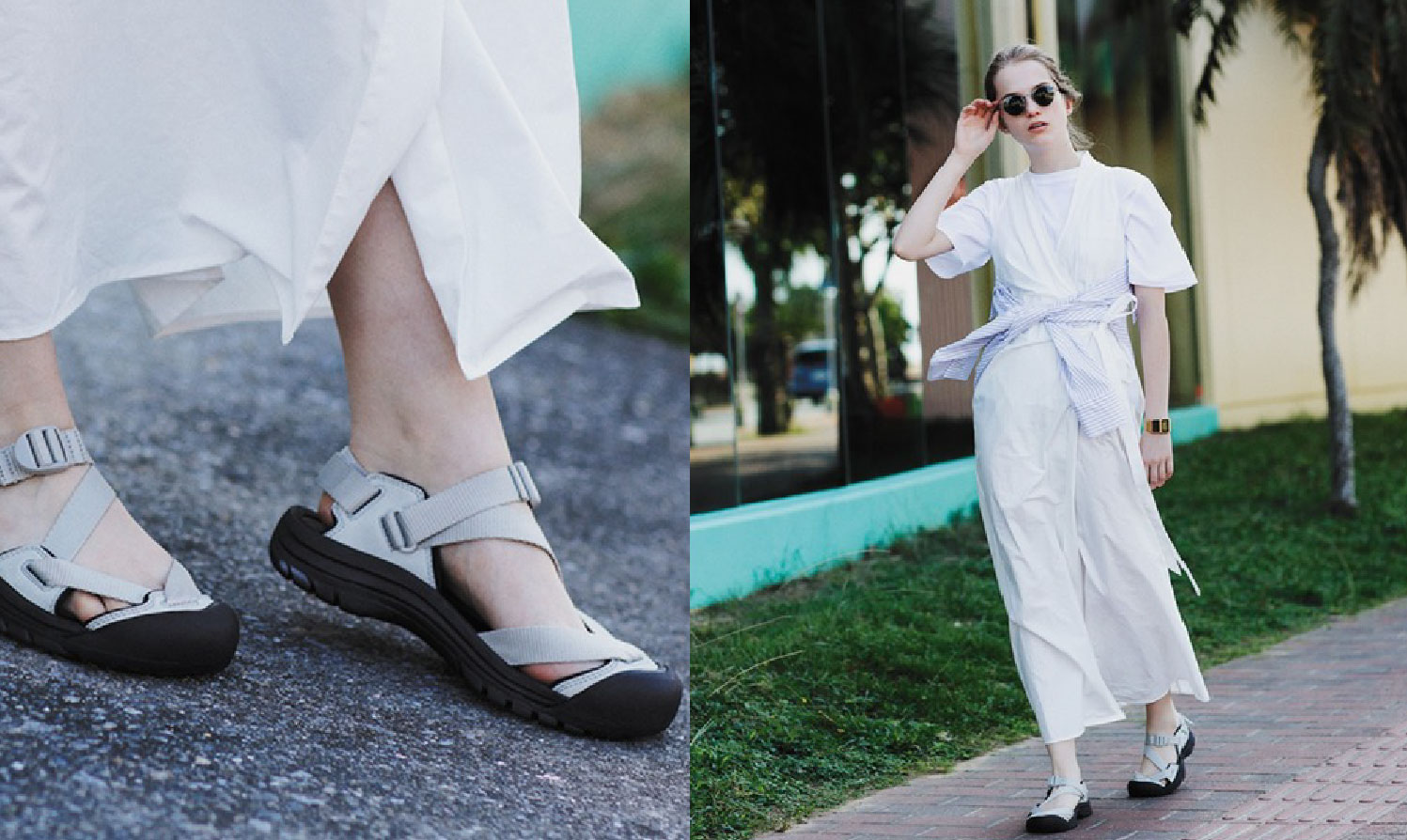 身為機能涼鞋王的KEEN,當然有各式各樣的涼鞋可以選擇,在人手一雙經典款編織涼鞋的21世紀,G邊私心推薦這雙水陸兩用包頭涼鞋~帶灰調的白色鞋帶,不顯腳背黑外,還帶點知性成熟感;而鞋底的黑色能讓你在雨天行走時不怕髒,與鞋帶的顏色更是搭配的非常恰當,