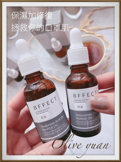 「10%維他命B3+2%淡紋四胜肽(修護)」:經常外出的那段時間容易把“口罩肌”帶回家,主要是口罩下的肌膚很容易黯沉、粗粗、摸起來有一顆顆,粉刺跟痘痘也很容易產生,夏天又快到了!得快將這瓶精華液給備上,因為它有超強10%維他命B3,對口罩肌有非常好的修護力,還能調節油脂分泌喔!另外類肉毒的淡紋四胜肽也有2%,嘴角、法令紋部分我會特別加強,但化妝水後得先用這款於深層作用,再疊擦玻尿酸!(《BFFECT》家的精華都不會起屑屑,真材實料!)